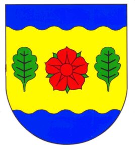 - Blasonierung: In Gold unter blauem Wellenschildhaupt und über blauem Wellenschildfuß eine rote Rose mit grünen Kelchblättern zwischen zwei grünen Eichenblättern.